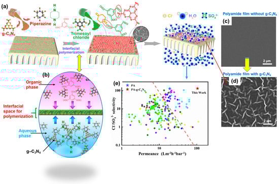 Fabrication process of a membrane utilizing a layer of porous g–C3N4: (a) Deposited on a support in order to conduct IP of two monomers, namely PIP and TMC, leading to polycondensation within the interfacial space. (b) Representation of TMC molecules dissolved in the organic phase, with the PIP (remaining in the aqueous phase) adsorbed on the g–C3N4 surface, resulting in a slow diffusion of PIP molecules through the pores. (c) Scanning electron microscopy (SEM) image of a tradition PA film without g–C3N4 and no porous morphology. (d) SEM image of a porous and double-layered PA membrane after IP, displaying a superstructure with ordered nanovoids. (e) permeance and selectivity of the membrane. Reprinted with permission from Nature Comm. [], Copyright 2023 Nature Portfolio. The article is licensed under a Creative Commons Attribution 4.0 International License, which permits use, sharing, adaptation, distribution, and reproduction in any medium or format, as long as you give appropriate credit to the original author(s) and the source, provide a link to the Creative Commons license, and indicate if changes were made.