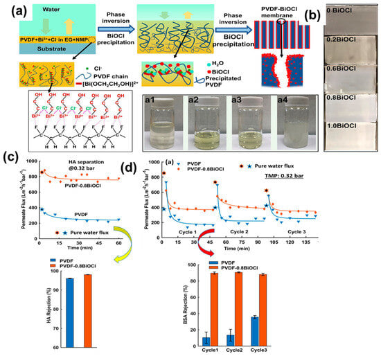 (a) Schematic representation illustrating the modified-blending-phase inversion and its mechanism for fabricating PVDF–BiOCl membranes: (a1) Bi3+ + Cl− + EG + NMP, (a2) EG + NMP + PVP + PVDF, (a3) Bi3+ + EG + NMP + PVP + PVDF, and (a4) Bi3++Cl− + EG + NMP + PVP + PVDF represent various solutions utilized in the studies. (b) Images of the membranes with varying BiOCl content formed from the reaction of ethylene glycol, potassium chloride (KCl), and bismuth(III) nitrate (Bi(NO3)3). (c) Changes in permeate flux and rejection ratios of the PVDF and BiOCl-0.8BiOCl membranes using 0.1 g/L humic acid (HA) solutions. (d) Permeation flux and rejection for BSA illustrating antifouling properties. Reprinted with permission from Separation and Purification Technology [], Copyright 2021 Elsevier.