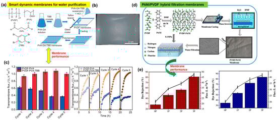 In the study, a phase-inversion method is employed to fabricate PVDF membranes with various PANI concentrations (Figure 10d). The addition of PANI (PANI (1–4 wt.%) increases the hydrophilicity of the resulting membrane with reduced pore size, as evidenced by the contact angle and SEM measurements. The operational experimental results demonstrate an enhancement in water flux from 28 to 47 L m−2 h, signifying increased hydrophilicity upon addition of PANI to PVDF. Furthermore, the performance tests exhibit high rejection of dye molecules (allura red and methyl orange) (Figure 10e).