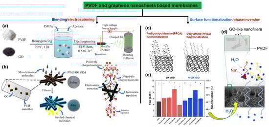 In a similar study focusing on hydrophobicity and its influence on water flux and salt rejection, GO nanosheets were functionalized covalently and subsequently integrated with PVDF via a phase inversion method to fabricate a hydrophobic membrane with higher efficiency (Figure 11c,d) []. Two grafting agents, octylamine (OA) and perfluoroctylamine (PFOA), with distinct degrees of hydrophobicity, were anchored onto the GO surface (Figure 11c). As a result, the increased contact angle and porosity in the membrane directly impact its flux and rejection, reaching 8.8 L m−2 h−1 and 99.9%, respectively (Figure 11e). These membranes demonstrate promising applications in water [,,,].