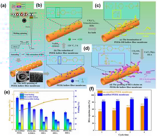 In a recent innovative approach, a PEEK hollow fiber membrane (PHFM) was initially fabricated from the blend of PEEK and PEI via melt spinning, as shown in Figure 13a []. Next, the ketone groups located on the surface of the hollow fibrous membrane were reduced to alcohol functionalities to anchor an active unit or initiator to create hydrophilic brushes via a controlled polymerization reaction, namely, atom transfer radical polymerization (ATRP) (Figure 13c,d). The analysis revealed that these hollow fibrous membranes were decorated with a hydrophilic layer of 2-hydroxylethyl acrylate (HEA) chains that directly affected the permeability, separation, and antifouling performance of the membranes [].