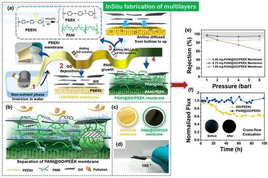 Schematic representation of the fabricating process for the PEEK-based–composite-separating membrane with multilayers made up of (a) different chemical components, that is, PANI, PEEKt, and graphene nanosheets integrated in four successive steps; wherein, (1) PEEKt was fabricated via phase inversion, (2) a layer of GO nanosheets was integrated to PEEKt, and (3) layers of PANI were created in situ accompanied with the reformation of PEEKt into PEEK, leading to the (4) PANI@GO/PEEK membrane with multiple interfaces. (b) Schematic diagram illustrating the separation process through multiple interfaces. (c,d) Depiction of the free standing film of the precursor, GO/PEEKt, and the final product, PANI@GO/PEEK, after hydrolysis and oxidative coupling polymerization of PEEKt. (e,f) The rejection of Rose Bengal sodium (RB) and crossflow of the PANI@GO/PEEK membranes, respectively. Reprinted with permission from the Adv. Sci. [], Copyright 2023 Wiley-VCH GmbH. The article is open access, distributed under the terms of the Creative Commons CC BY license, which permits unrestricted use, distribution, and reproduction in any medium, provided the original work is properly cited.