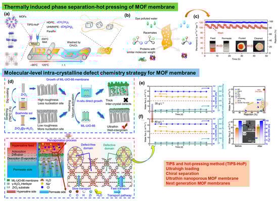 (a) TIPS and hot pressing were used to fabricate roll–roll membranes of MOF in which MOF crystals were loaded into the matrix of HDPE (Mw > 40,000, melt index = 2.2 g per 10 min) and UHMWPE (Mw > 1,500,000) in a molten state which, after cooling to 90 °C, was pressed to manufacture the membranes, with their (b) individual selectivity and permeation for different molecules such as dyes, racemates, and proteins in water; (c) high performance and recyclability of the membrane with a fouled and cleaned stage; (d) ultrathin nanoporous MOF membrane with intra-crystalline defects as created via missing linker within the MOF. (e,f) The ultrathin membrane with manipulated defects showed a higher water flux and salt rejection as compared to the membrane without any defects. Reprinted with permission from Nature Communi. [], Copyright 2019 Nature Portfolio, and Nature Communi. [], Copyright 2023 Nature Portfolio, respectively. These articles are licensed under a Creative Commons Attribution 4.0 International License, which permits use, sharing, adaptation, distribution, and reproduction in any medium or format, as long as you give appropriate credit to the original author(s) and the source, provide a link to the Creative Commons license, and indicate if changes were made.
