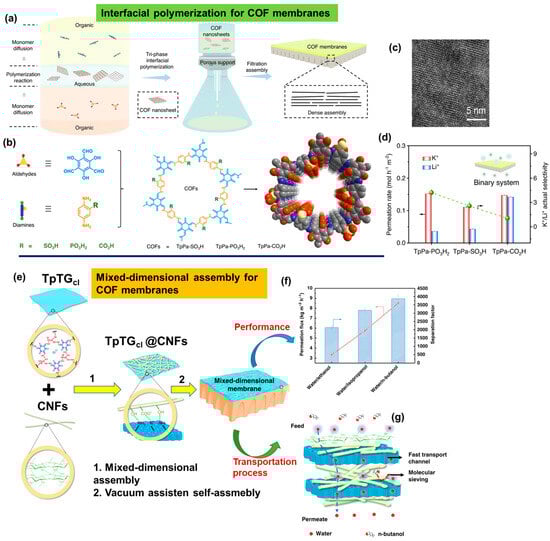 As the monomers diffused towards the aqueous phase, they underwent polymerization in the interfacial space, resulting in the assembly of COF nanosheets. These nanosheets displayed a dimensional crystalline lattice, as observed with high-resolution TEM (Figure 17c). Subsequently, from the colloidal solution of these nanosheets, a membrane was fabricated via a filtration assembly using a porous support (PTFE with an average pore size of 200 nm) (Figure 17a). For a binary mixture of K+/Li+, these membranes have shown a high ion permeance with a selectivity of 4.2–4.7. The permeation performance of these membranes was high for single-cation transport, whereas it decreased significantly for binary mixtures (Figure 17d). Nevertheless, the study demonstrated a novel concept of confined cascade separation to successfully enhance the ion transport and separation processes [].