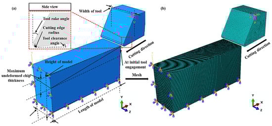 Figure 2a showcases the setup of the 3D finite element (FE) cutting model used in micromachining, while