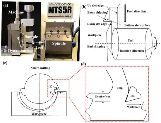 The experimental procedures were executed using an ultra-precision tabletop machine tool, the Nanowave MTS5R. This device operates with a steady power output of 100 W (240 V) and can reach a maximum spindle speed of 80,000 rpm in dry conditions. It features three axes (X, Y, Z), each with a resolution of 0.1 μm, and is driven by a DC servo motor. To measure the cutting forces, a Kistler cutting force dynamometer (9256C2) was utilized, as depicted in