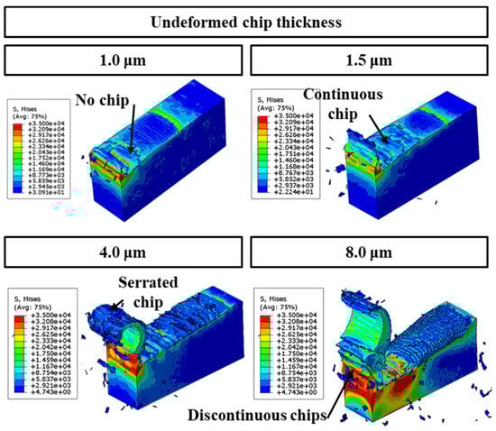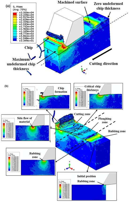 Figure 4b delineates the FE cutting process focusing on material removal under the specified cutting parameters: a 2.0 µm undeformed chip thickness and a 1.5 µm cutting tool radius. Notably, the initial phase of tool–workpiece interaction is characterized by observable lateral material flow, indicating a prevalent topological manipulation or ploughing action. The cessation of lateral material flow signifies a critical transition from ploughing to a shear mechanism, corresponding to the minimum undeformed chip thickness. Furthermore, the von Mises stress measurements employed in this study are quantified in megapascals (MPa).