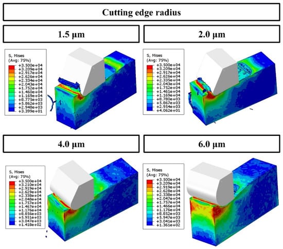 40]. In this simulation, cutting-edge radii of 1.0 µm, 1.5 µm, 2.0 µm, 4.0 µm, and 6.0 µm were examined. Moreover, the undeformed chip thickness is set at seven levels: 0.5 µm, 1.0 µm, 1.5 µm, 2.0 µm, 4.0 µm, 6.0 µm, and 8.0 µm. The tool’s leading and clearance angles are set at 30.0° and 6.0°, respectively. The model’s dimensions for length, width, and height are 40.0 µm, 12.0 µm, and 18.0 µm, respectively. The simulation parameters, including the tool angle, align with those used in the confirmatory experiments conducted in this research.