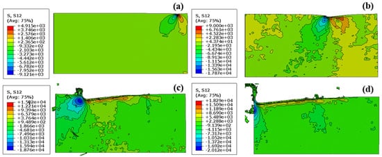 Figure 10 illustrates the simulation results concerning shear stresses under the set conditions of a 2.0 µm undeformed chip thickness and a 1.5 µm cutting tool radius.