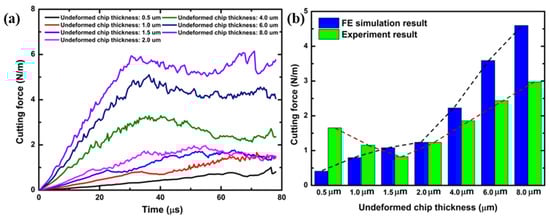 Figure 11a displays the finite element (FE) simulation of the resultant force and material removal under the cutting parameters of an undeformed chip thickness of 2.0 µm and various cutting tool radii. As the undeformed chip thickness increases, the FE cutting force also rises.