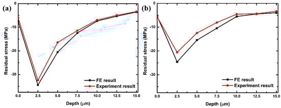 Experimental data, showing peak compressive residual stresses at 32.1 MPa and 20.3 MPa 2.5 μm below the surface, corroborate the FE model, validating the simulation’s reliability and applicability.