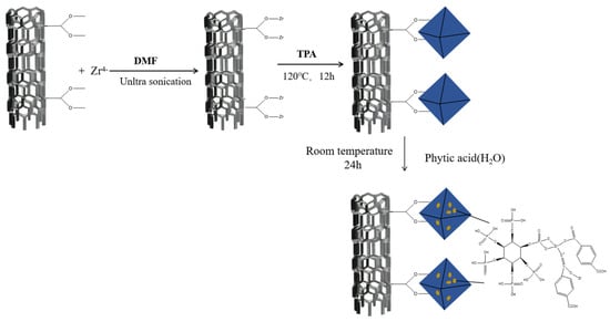 MWCNT@UiO-66 (1.0 g) was weighed and dispersed in a blue bottle containing 150 mL DMF. Then, PA (10.68 mL) was added to the above MWCNT@UiO-66 suspension, followed by ultrasonic dispersion for 20 min. Thereafter, the mixture was continuously stirred for 24 h at room temperature using a magnetic agitator. The black precipitate obtained was filtered and centrifugally washed with DMF and ethanol 3 times. The final PA@MWCNT@UiO-66 product was then dried in a vacuum-drying oven at 85 °C for 24 h. The synthetic route is presented in Figure 1.