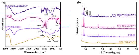 FT-IR spectra (a) and XRD patterns (b) of UiO-66@PA@MWCNT, UiO-66@MWCNT, MWCNT−COOH, and UiO-66.