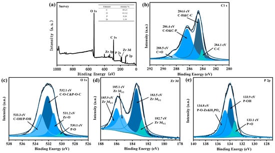 An AXIS Ultra XPS instrument (Shimadzu Company of Japan, Kyoto, Japan) was used for testing the chemical states of elements. Its cathode was made of a lanthanum–aluminum–molybdenum alloy, and the analysis was conducted with a power input of 400 W. The background was a non-rotating background compensation type, and the peak function was the Lorentz–Gaussian function. The powder to be tested was adhered to the tin foil with viscose, folded and pressed, then unfolded and cut into specimen of 5 mm × 4 mm. Chemical states, such as C1s, Zr3d, P2p, and O1s, were determined by scanning the surface of the sample.