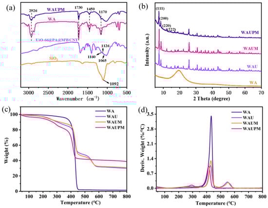 FT-IR spectra (a) and XRD patterns (b) of WAUPM, WA, UiO-66@PA@MWCNT and TGA (c) and DTG (d) curves of WAUPM, WAUM, WAU, and WA.