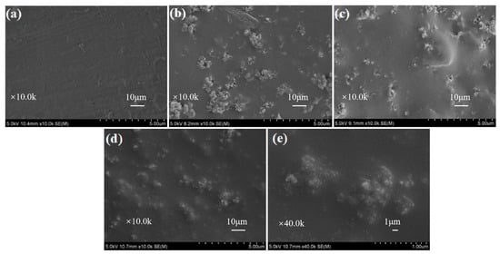 Different from the additive flame retardants, the PC/ABS flame retardants with different coating thicknesses were prepared by spraying the MOFs-based acrylic emulsions on the surface of PC/ABS. The steps of spraying and drying were repeated until the coating thickness reached the required standard (±10%). The micro-structures of the coated PC/ABS substrates were studied by SEM. As shown in Figure 5, the untreated PC/ABS showed a slightly but uniformly fluctuating surface, while the PC/ABS coated with a MOFs-based flame retardant showed many granular structures on the substrate, presumed to be UiO-66 crystals. It was also found that the substrate became smoother when the thickness of the flame-retardant coating was increased. As seen from Figure 5c,d, the PC/ABS substrates were coated completely above a 750 μm thickness. There were less prominent granular structures on the WAUM-3 surface. WAUPM-3 showed a choppy surface morphology, but with fewer bright MOFs and smoother surfaces. In the magnified SEM images, smaller SiO2 nano-particles and larger MOFs were observed, as shown in Figure 5e. Compared with WAUM-3, WAUPM-3 showed an improved surface smoothness. It implied that PA improved the compatibility of MWCNT@UiO-66 with acrylic resin. It also improved the wrapping and maximized the interfacial bonding between the adhesive layer and the PC/ABS substrate. Thus, PA@MWCNT@UiO-66 can be expected to provide a good flame-retardancy to PC/ABS.