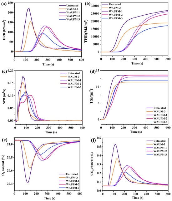 Curves for heat release rate (HPR) (a), total heat release (THR) (b), smoke production rate (SPR) (c), total smoke production (TSR) (d), CO2 (e), and O2 (f) contents of untreated, WAUM-3, WAUPM-1, WAUPM-2, and WAUPM-3 samples.