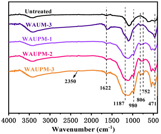 In order to understand the mode of action of MOFs-based flame-retardant coatings, the carbon residues were carefully characterized by FT-IR spectroscopy, SEM, and Raman spectroscopy. Figure 8 presents the FT-IR spectra of carbon slags after the cone calorimetry test. WAUM-3 showed weak absorption peaks at 806 cm−1 and 752 cm−1, ascribed to the out-of-plane deformation vibrations of the benzene ring =C-H, and para-substituted and mono-substituted benzene ring, respectively. The peaks at 1622 cm−1 and 471 cm−1 corresponded to the aromatic structure and Zr-O stretching vibrations, respectively. This result indicated that zirconia was produced after the combustion of WAUM-3 and that the aromatic structures of UiO-66 promoted the formation of carbon layers. Furthermore, the WAUPM coated samples showed P-O-C stretching vibrations at 980 cm−1 and peaks at 1187 cm−1 and 1092 cm−1 for P=O absorption and Si-O-Si absorption, respectively. This suggested that PA was decomposed during the combustion process to phosphoric acid, meta-phosphate, and other compounds. These compounds were esterified with the pyrolysis products of PC/ABS containing hydroxyl groups. Moreover, the presence of nano silica and carbon nanotubes promoted the formation of dense and continuous coke layers. Hence, as the coating thickness increased, the intensities of both P-O-C and Zr-O peaks in the carbon slag increased, as shown in Figure 8 for WAUPM-1, WAUPM-2, and WAUPM-3. Zirconia produced by the decomposition of zirconium organic framework also served as an efficient thermal barrier when mixed with the carbon layer. Thus, the product improved the thermal stability and thermal shielding property of the carbon layer.