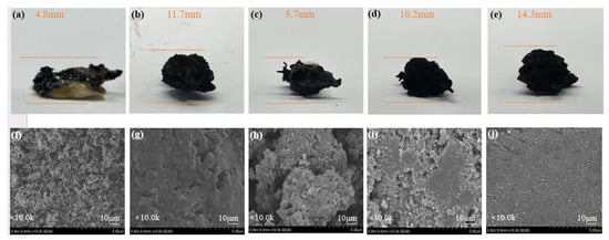 Macroscopic images and SEM images of carbon residues after vertical combustion test: (a,f) Untreated; (b,g) WAUM-3; (c,h) WAUPM-1; (d,i) WAUPM-2; and (e,j) WAUM-3.