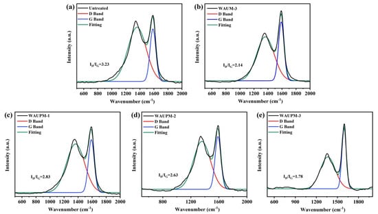 Raman spectroscopy was employed to further characterize the degree of graphitization. Figure 10 presents the Raman spectra of samples. Peak D and peak G at about 1350 cm−1 and 1600 cm−1 corresponded to the peaks of amorphous carbon and graphitized carbon, respectively. The higher the degree of graphitization, the better the effect of heat insulation and oxygen isolation. As shown in Figure 10, as the thickness of the coating increased in WAUPM-1, WAUPM-2, and WAUPM-3, the ID/IG value decreased. Finally, the carbon residue of WAUPM-3 had the lowest ID/IG value. Compared with untreated PC/ABS and WAUM-3, the ID/IG value was also much smaller for WAUPM-3. These results indicated that WAUPM-3 had the highest degree of graphitization after carbon combustion, which displayed a good barrier effect and effectively inhibited the thermal degradation of the underlying PC/ABS. This observation was consistent with the SEM results.