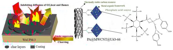 A flame-retardant coating on the surface of a substrate represents an important method for controlling flammability. Compared with the method of adding flame retardants, the intrinsic properties of the polymer are not compromised in the surface coating method. This method also has the advantage of easy processing and can be used for a variety of materials [11]. In recent years, metal organic frameworks (MOFs), which are organic–inorganic hybrid materials comprising metal ions and organic ligands, have been found to have flame-retardant properties. At high temperatures, MOFs decompose to form catalytic species that promote oxidation and coking [12,13,14]. In particular, a zirconium organic framework, UiO-66, has been found to be a promising material for use in retardant systems. It has a high specific surface area (1000 m2/g) [15] and excellent thermal, water, and acid stability, which is conducive to the post-synthesis modification of UiO-66. However, applying MOFs alone cannot provide sufficient flame-retardancy.