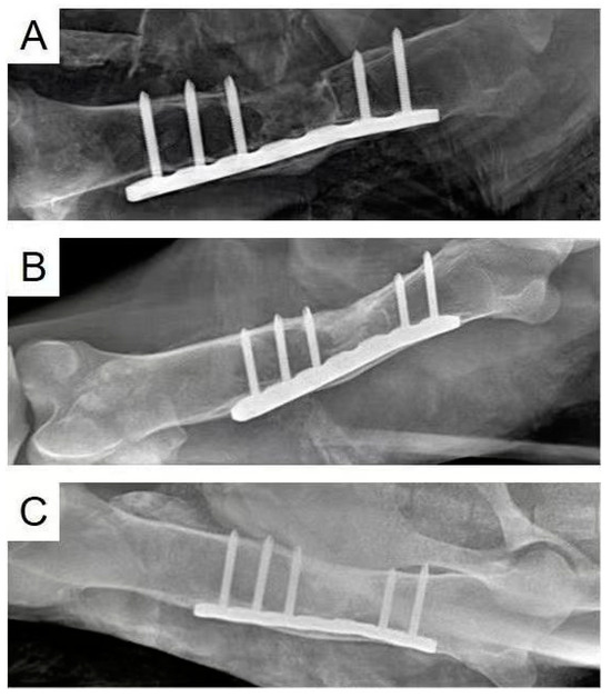 X-ray images of the femur defect at 1 (A), 3 (B), and 6 (C) months after the MC/PLA scaffold implantation in 3-month-old sheep.