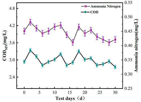Chemical oxygen demand (COD) is often used as an indicator to measure the concentration of organic matter in water. According to the test indices outlined in the “Sanitary Standards for Drinking Water” (GB5749-2022), the CODMN and ammonia nitrogen values of water samples should not exceed 3 mg/L and 0.5 mg/L, respectively. Figure 3 illustrates the changes in CODMN and ammonia nitrogen values of water samples during the experiment.