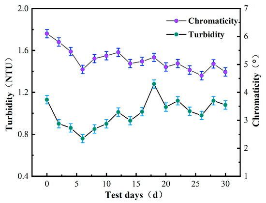 As illustrated in Figure 2, both the turbidity and chromaticity of water were highest during the first few days of detection. Apart from summer rainfall, corrosion cannot be ruled out as a contributing factor, resulting in a yellowish tint that is visible to the naked eye. The water samples were intermittently stirred during measurement to minimize the effects of other factors on the readings. Due to the influence of autumn rainfall and temperature, rainwater mixed with sediment had a greater impact on water quality, resulting in an increase in water sample color that exceeded the detection indicators established by the “drinking water health standards.” This highlights the importance of accounting for these environmental factors when evaluating drinking water purification performance.