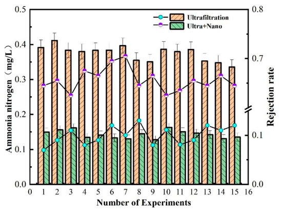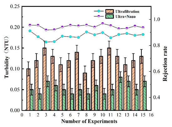 To ensure the accuracy of the ultrafiltration and nanofiltration membrane combination process for drinking water purification, the effects of turbidity, CODMN, and ammonia nitrogen treatments were analyzed by increasing the number of experiments. Additionally, by comparing the water quality of drinking water treated by the ultrafiltration unit and “ultrafiltration + nanofiltration,” the treatment effects of each filter unit in the combined ultrafiltration and nanofiltration membrane process for drinking water were explored.