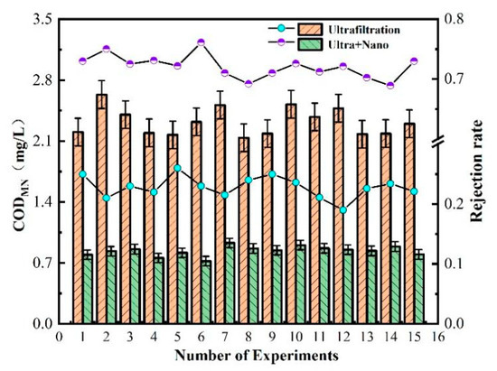 Removal efficiency of membrane combination process for CODMN in water quality.