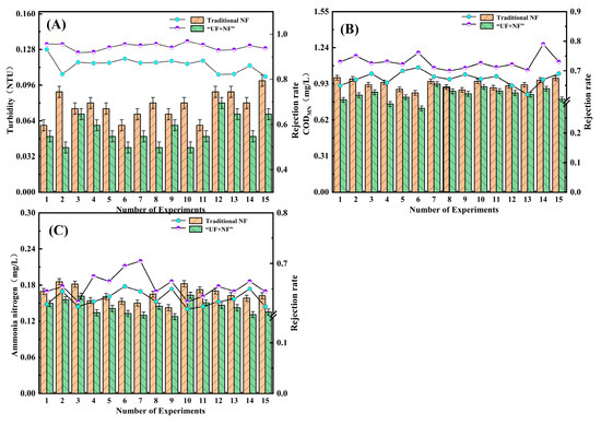Comparison of turbidity, CODMN and ammonia nitrogen removal between conventional nanofiltration membrane and combined membrane process: (A) removal efficiency for turbidity in water quality; (B) removal efficiency for CODMN in water quality; (C) Removal efficiency for ammonia nitrogen in water.