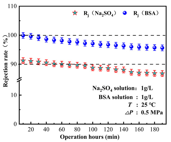 To evaluate the stability of the nanofiltration unit, long-term continuous filtration tests were performed on the membrane at room temperature and under a pressure of 0.5 MPa, as shown in Figure 2, Figure 3, Figure 4, Figure 5, Figure 6, Figure 7 and Figure 8, to assess its ability to intercept pollutants. The rejection rates of Na2SO4 and BSA by the nanofiltration unit remained stable, with a change range of less than 5%. The IP-ZrO2/BCM-NFM membrane showed excellent performance in separating divalent salt solution from bovine serum protein. Li et al.’s single cellulose nanofiltration membrane exhibited a retention rate of only 71.23% for Na2SO4 [32]. In comparison, the utilization of combined membrane technology demonstrates a more pronounced impact on inorganic salt retention than that observed with a single nanofiltration membrane. This enhanced performance is attributed to the synergistic sieving effect and charge repulsion resulting from the pore sizes of both ultrafiltration and nanofiltration membranes. Despite the fact that the addition of ZrO2 particles in a single ZrO2/BCM ultrafiltration membrane aids in filling pores, improving membrane resistance, and achieving a BSA retention rate exceeding 91% [42], the retention rate of the combined membrane technology surpasses that of the single ZrO2/BCM, reaching an impressive 99.99%. This superiority is ascribed to the smaller pore size of the nanofiltration membrane in the composite structure, significantly amplifying the sieving effect of the pore size and enabling the interception of macromolecular pollutants passing through the ultrafiltration membrane.