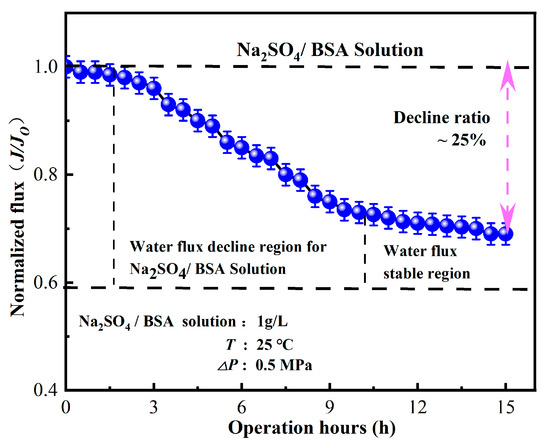 A solution containing Na2SO4/BSA with a concentration of 1 g/L was added to the feed in the same proportion. The solution was then passed through the membrane at 25 °C and 0.5 MPa for a total of 15 h. The membrane’s permeation fluxes were recorded both at the beginning and after filtration. Prior to the extended dynamic experiment, the membrane was pre-conditioned in the membrane filtration system for 0.5 h. Each test was conducted three times to ensure data accuracy and reliability while preventing pollution due to changes in the feed solution and other factors that might affect membrane performance. The average value, denoted as J1, was then calculated.