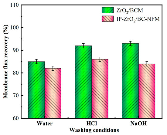 In this study, the contaminated cellulose membrane was subjected to cleaning with water, acid, and alkali, respectively, using the membrane filtration system. Figure 2, Figure 3, Figure 4, Figure 5, Figure 6, Figure 7, Figure 8, Figure 9 and Figure 10 show the membrane flux recovery rate after cleaning the cellulose membrane with the same pollutant interception under different conditions. It is observed that when water is used as the cleaning agent, the recovery rate of membrane flux is significantly lower than that of acid and alkali washing. The flux of modified ZrO2/BCM after washing can be recovered to 86%, which indicates that the addition of ZrO2 effectively reduces the contact between pollutants and the membrane surface. The membrane flux recovery rate of IP-ZrO2/BC-NFM is slightly lower than that of ZrO2/BCM, which may be due to the smaller pore size of the nanofiltration membrane. The nanofiltration membrane can effectively intercept pollutants, while the pollutants stay in a smaller pore size, which is difficult to remove.