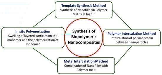 Biopolymeric or polymeric nanocomposites, in general, have been synthesized using various methods, such as the template synthesis method, melt intercalation, polymer intercalation from a solution, and the in situ polymerization method as mentioned in Figure 2.