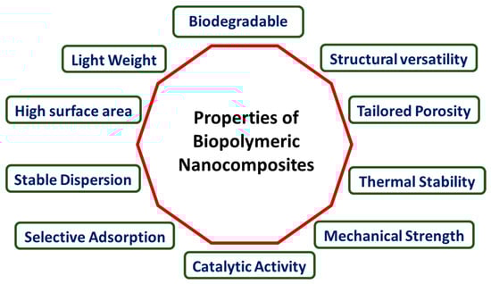 Nanomaterials are practical and efficient solutions to get through major roadblocks in creating effective remedial technologies for wastewater treatment [24]. The large surface-to-volume ratio and numerous reactive sites of nanomaterials make them highly reactive toward quick and efficient removal of water pollutants [25]. Nanostructured adsorbents can be specifically designed to target pollutants and possess a substantial capability for addressing contaminated water [26,27]. There is also growing research focusing on the synthesis of biodegradable polymers for wastewater remediation. Natural polymers called biopolymers are either produced from sustainable natural resources or biosynthesized by living organisms [28]. Biopolymers are mostly composed of polysaccharides, and polypeptides. Biopolymers can be divided into three categories: nature-derived, chemically produced, and microbial biopolymers [28,29]. Renewability, biocompatibility, environmental compatibility, biodegradability, and antimicrobial activity are only a few of the impressive interrelated biological, physical, and chemical characteristics of biopolymers [29,30]. Reactive functional groups such as carbonyl, amide, carboxyl, and hydroxyl are present in the skeleton of biopolymers, which make them suitable for wastewater treatment [31]. However, the cost inefficiency of the synthesis and purification procedures is a significant problem that has been noticed throughout the scaling up of biopolymers [32]. Recently, there has been a surge in the scientific significance of biopolymer nanocomposites owing to their versatile applications in addressing environmental issues and remediation challenges [33]. Biopolymeric nanocomposites have been used to remove heavy metals, natural organic matter, dyes, antibiotics, and other water pollutants such as coagulants, adsorbents, flocculants, membranes, and photocatalytic agents [11,34]. Biopolymeric nanocomposites have enhanced physiochemical, thermophysical, and mechanical properties compared to nanomaterials and polymers [35]. Inorganic nanofillers such as metal and metal oxide nanoparticles, nanoclays, and carbon nanomaterials can be included in a biopolymer matrix to produce biopolymeric nanocomposites [36,37,38].