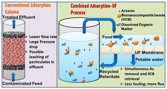 Schematic representation of conventional treatment of contaminated water with adsorption (left) and with ultrafiltration membranes (right) by using iron oxyhydroxide chitosan beads (IICBs) as the biopolymeric-chitosan-based bionanocomposite [153].
