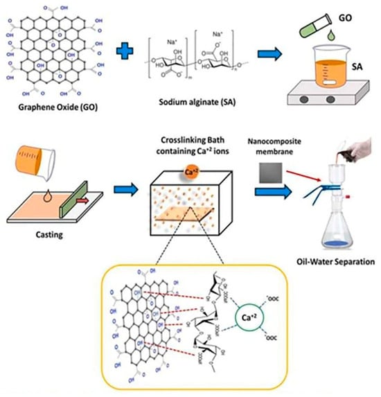 Schematic representation of oil–water separation by using alginate-GO-based nanocomposite membranes [154].