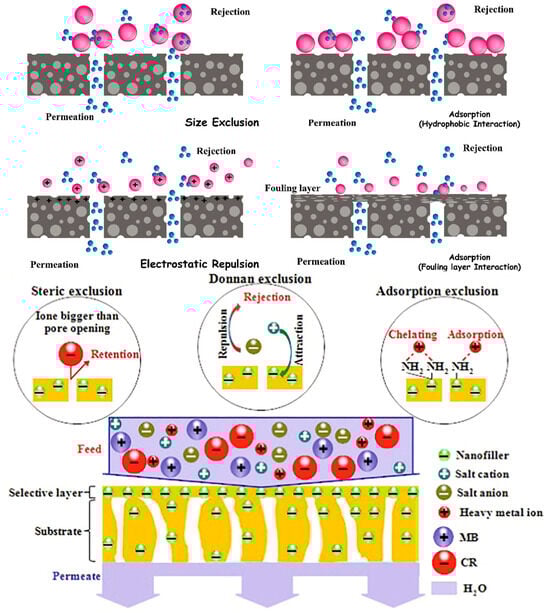 The size exclusion mechanism operates by permitting molecules with dimensions smaller than the pore size to traverse the membrane, while larger species are impeded. Membranes featuring an accumulation of surface electric charge repel species carrying the same surface charges, facilitating the passage of neutral species as shown in Figure 7. The performance of membrane separation processes is significantly influenced by the physical and chemical interactions between chemicals and the membrane [58].
