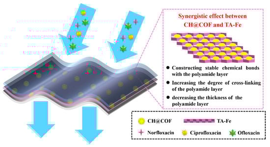 Pictorial representation of a thin-film composite nanofiltration membrane composed of chitosan hydrogel covalent organic framework interlayered with tannic acid-Fe3+ to remove norfloxacin, ciprofloxacin, and ofloxacin antibiotics from water [156].