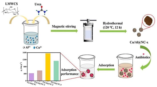 Schematic illustration of formation of low-molecular-weight chitosan (LMWCS)-Cu/Al with nitrogen-doped carbon microspheres, with hydrothermal method, as an excellent high-performance adsorbent for oxytetracycline antibiotic removal [177].