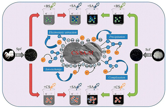 Schematic illustration of the preparation of semi-carbonized plant fiber (Spf) and chemical fiber (Scf) using dodecyl dimethyl betaine (BS) and chitosan (CS) as modifiers to enhance Sfs. Sodium alginate (SA) served as the composite modifier to further modify BS-Sf and CS-Sf (dodecyl dimethyl betaine and chitosan-modified semi-carbonized fibers), resulting in the preparation of BS/SA-Sf and CS/SA-Sf (sodium-alginate-composite-modified BS-Sf and CS-Sf) to remove Zn(II), Pb(II), and Cd(II) heavy metal ions from polluted water [178].