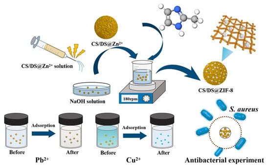 Li et al. formulated a bifunctional composite microsphere adsorbent, CS/DS@ZIF-8, resulting from the combination of a zeolite imidazolate framework (ZIF-8) with chitosan microspheres doped with silica (CS/DS), utilizing the electrospraying method. Characterization analyses indicated a superior crystallinity, increased specific surface area, diverse distribution of pore size, heightened thermal stability. Adsorption studies revealed that CS/DS@ZIF-8 adhered to the Langmuir model as well as the pseudo-second-order kinetics model, displaying maximal capacities of 340.94 mg/g for Pb2+ and 308.27 mg/g for Cu2+. These results demonstrated sustained adsorption rates of 81.3% for Pb2+ and 72.9% for Cu2+ over five cycles. This innovative microsphere effectively addresses both chemical and biological pollutants for water remediation (Figure 12) [183]. Wang et al. utilized advanced techniques, specifically freeze–drying and 3D printing, to fabricate a chitosan/hydroxyapatite, CS/HAP, composite adsorbent and a series of monolithic polylactic acid (PLA), PLA@CS/HAP, filters. This innovative method imparted distinctive macroscopic microchannel structures to the monolithic PLA@CS/HAP filters, significantly enhancing their Cu2+ removal capacity. The study revealed that the adsorption process aligned with Freundlich and pseudo-second-order models, suggesting a multi-layer adsorption with chemisorption characteristics for the CS/HAP composite adsorbent. Cu2+ reusability experiments demonstrated the resilience of PLA@CS/HAP filters, maintaining consistent Cu2+ removal capacity over five consecutive adsorption–desorption cycles, with a significant removal efficiency of 97.17% [184].