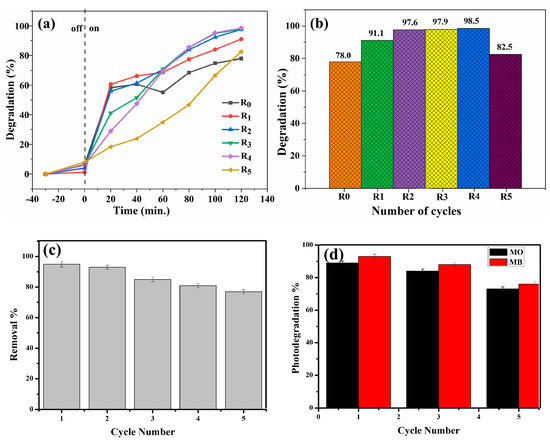 Reusability of biopolymeric nanocomposites: (a) chitosan-Fe3O4 nanocomposite for photocatalytic ability and (b) photodegradation of methylene blue dye for 120 min UV irradiation [203], and chitosan-based ternary nanocomposite with TiO2 and Ag nanoparticles on cellulose fabric (c) for removal of Cu (II) ions and (d) for photodegradation of methyl orange and methylene blue dye [204].