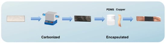 The multilayer hot-pressed FSC was cut into 50 × 25 mm strips and heated to 800 °C, 900 °C, and 1000 °C, respectively in a furnace under the flow of inert gas, and then removed after natural cooling. The specific carbonization conditions were first increased at a rate of 5 °C min−1 to 150 °C held for 60 min, then raised at the same rate to 350 °C, also held for 60 min, and finally increased at a rate of 2 °C min−1 to the target temperature. Thus, the CFSC was obtained. Then, the obtained CFSC conductive films were cut into 30 × 10 mm long strips, and conductive copper foil was pasted at both ends. The width and length of the copper foil electrode connected at both ends of the sensor obtained were 10 mm and 5 mm, respectively, and the distance between the copper foil at both ends was 20 mm. Afterward, the CFSC strips were placed into the prepared mold using PDMS substrate encapsulation (A and B were mixed in a weight ratio of 10:1) and dried in an oven at 60 °C. The fabrication scheme of flexible piezoresistive sensor was shown in Figure 1.