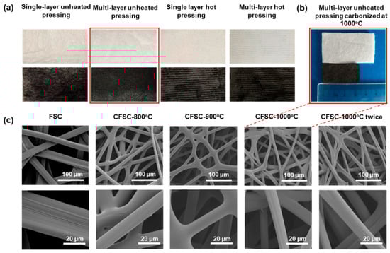 (a) Photographs of different forms of FSCs before and after carbonization; (b) photograph of a multilayer FSC and CFSC carbonized at 1000 °C; (c) SEM images of pristine FSC and CFSCs under different carbonization temperatures.