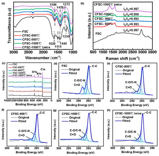 (a) The ATR-IR spectra of FSC and CFSCs under different carbonization temperatures; (b) Raman spectra of FSC and CFSCs under different carbonization temperatures; (c) XPS survey spectra of FSC and CFSCs under different carbonization temperatures; (d–h) high-resolution C 1s profiles of FSC and CFSCs under different carbonization temperatures: (d) FSC; (e) CFSC-800 °C; (f) CFSC-900 °C; (g) CFSC-1000 °C; (h) CFSC-1000 °C twice.