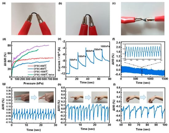 (a–c) Bending and torsion of flexible piezoresistive sensors; (d) the sensitivity of CFSC under different carbonization temperatures; (e) the I-t curves of the sensor using CFSC-1000 °C under serial pressures; (f) the excellent stability of the sensor after 800 pressure cycling tests under 40 kPa; (g–i) the signal responses from human movement: (g) finger pressing; (h) finger bending; (i) wrist bending.