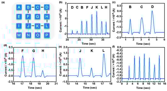 (a) A 4 × 4 sensor array and D–C–B–F–J–K–L–H sequential pressure load run diagram; (b) signal response of the sensor array during a continuous sequence of pressure loads following the D–C–B–F–J–K–L–H pattern; (c–e) relative current change intensity obtained by the sensor array at different positions; (f) response current when different pressure loads are applied to point D.