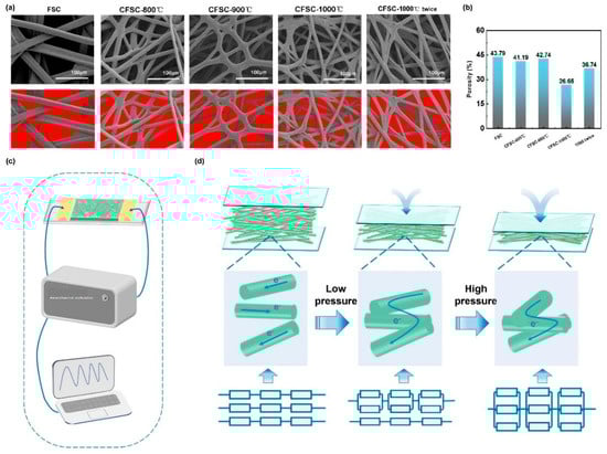 (a) Porosity analysis of the FSC and CFSCs under different carbonization temperatures according to SEM images; (b) the porosity of FSC and CFSCs under different carbonization temperatures; (c) schematic diagram of the electrical signal test system; (d) schematic model of the piezoresistive mechanism of CFSC-based multilayer pressure sensors.